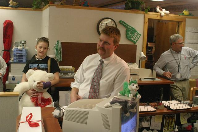 This young woman had been called to the office to get her own valentine's gift, and wound up trapped while we sang.